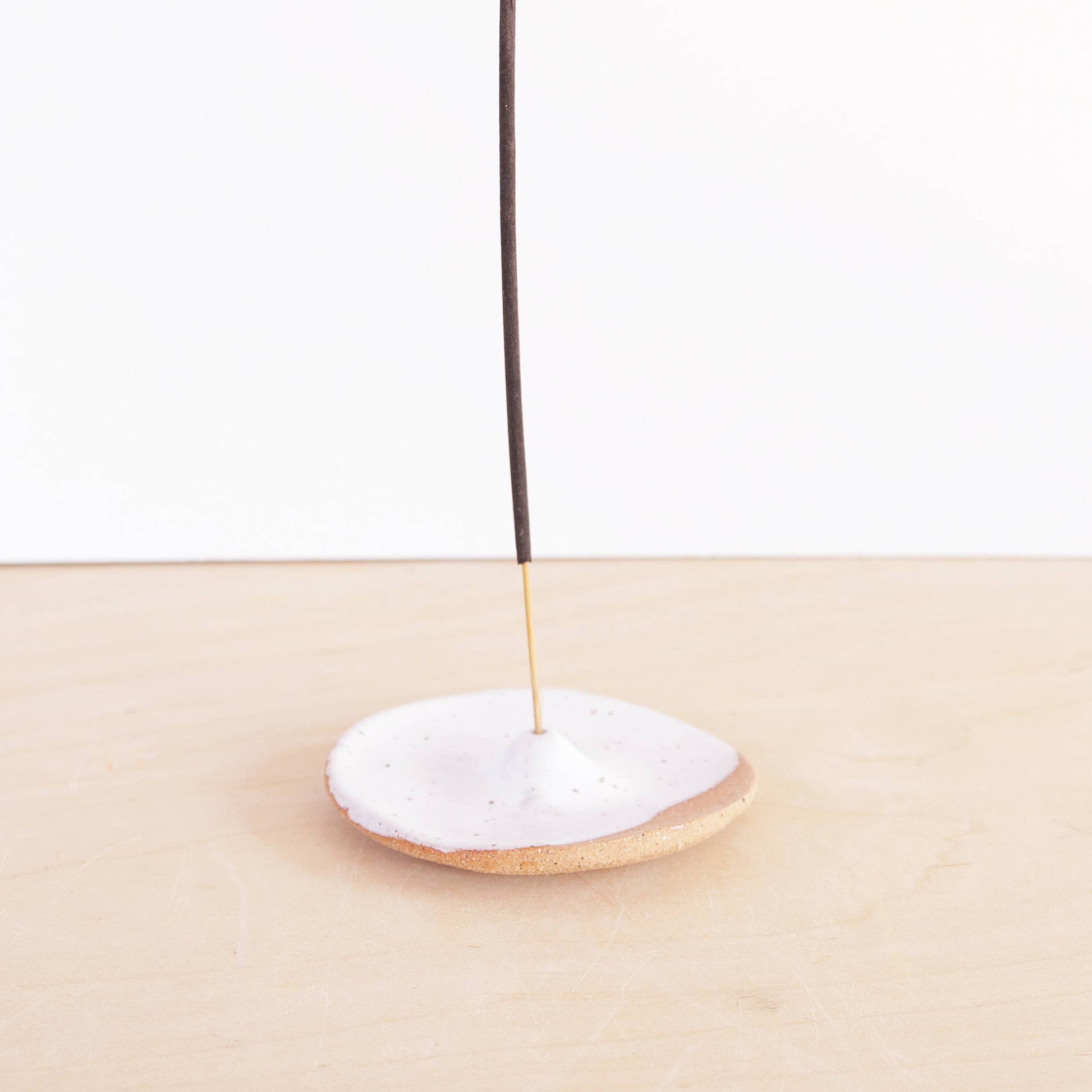 Modern, minimalist incense holder. Made of a speckled stoneware clay, finished with white glaze. Approx 3” diameter.