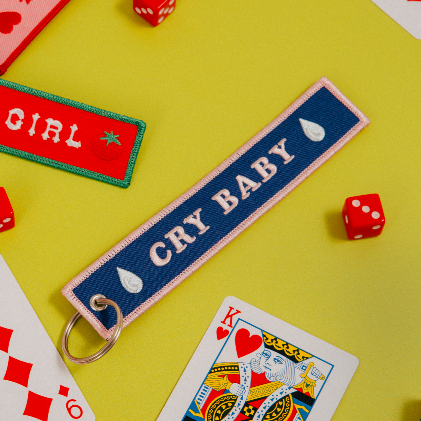 A bold little tag for emotional support keys, bags, or backpacks. Made from sturdy woven nylon with crisp embroidered lettering, this piece is equal parts dramatic and durable.