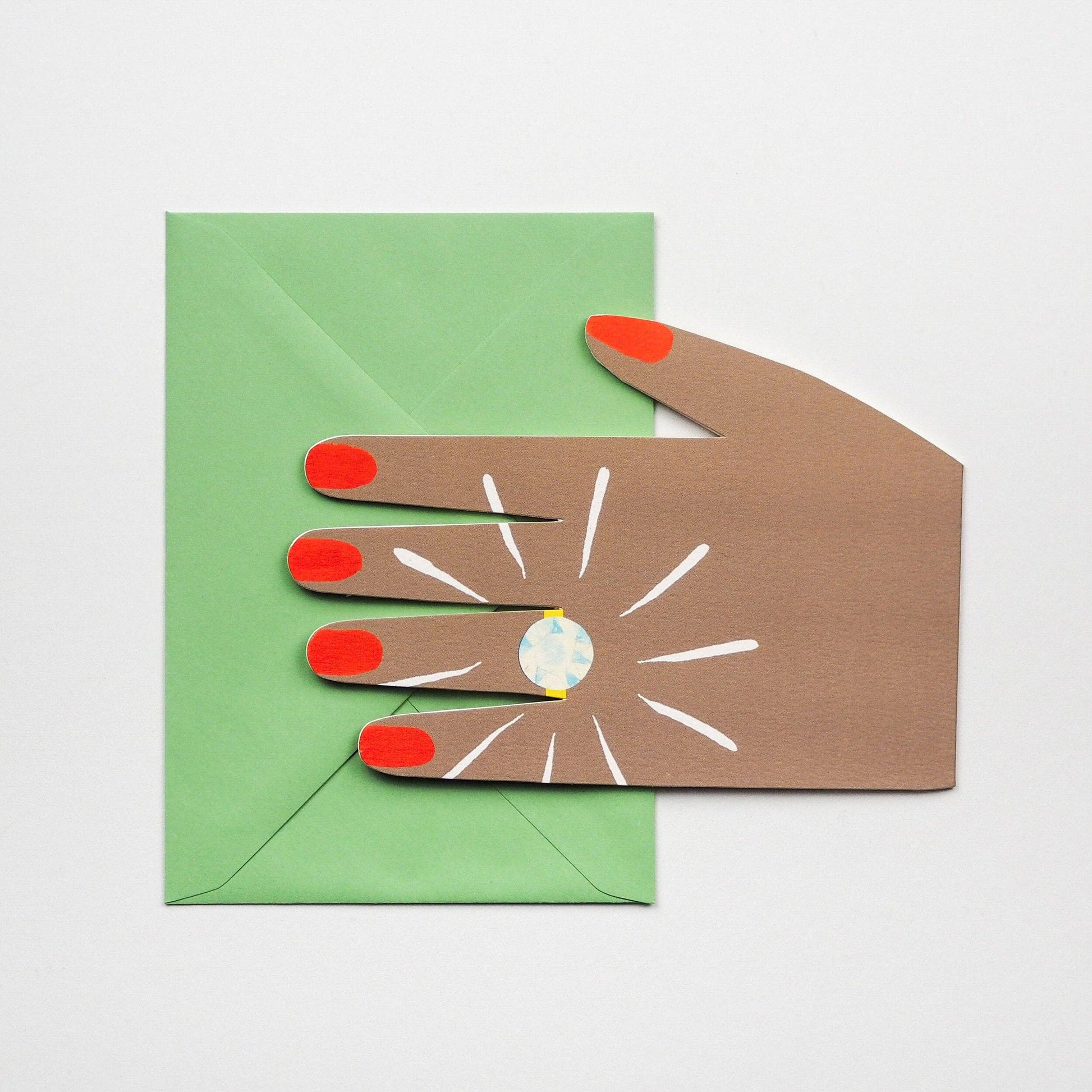 What a whopping diamond ring! And spangly red nails to match. Make your congrats card the most snazzy one on the happy couple's mantelpiece. Printed on high quality 300gsm card. Each card measures 11.5cm x 15cm when folded and comes in a handsome green envelope, the inside is left blank for your own message.