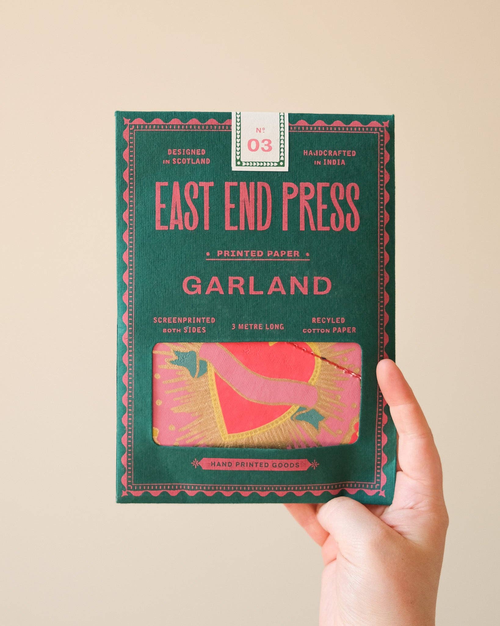 Inspired by sacred hearts and Mexican folk art, this garland is full of kitsch and romance. Ten decorative, bejewelled hearts create the three metre garland. 3 metres long. Includes 10 paper shapes, sewn along strong cotton thread. Screen printed by hand on both sides by talented artisans in Jaipur. Sustainably made from recycled materials.