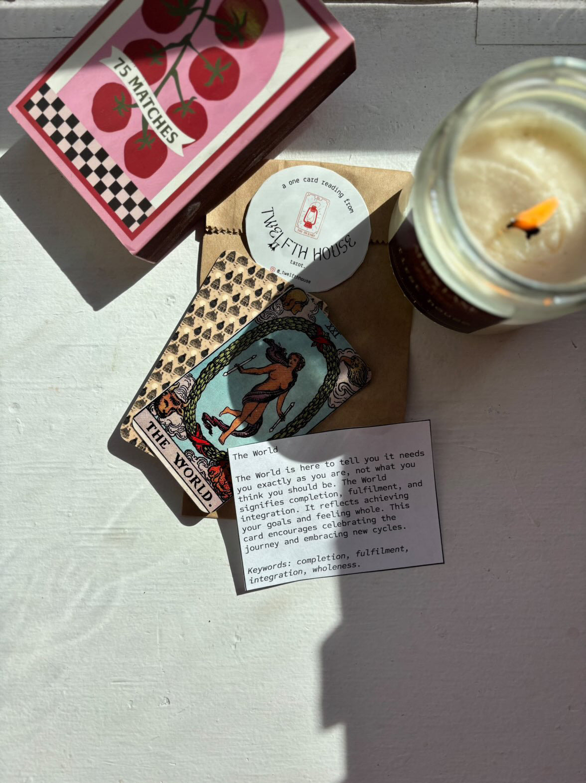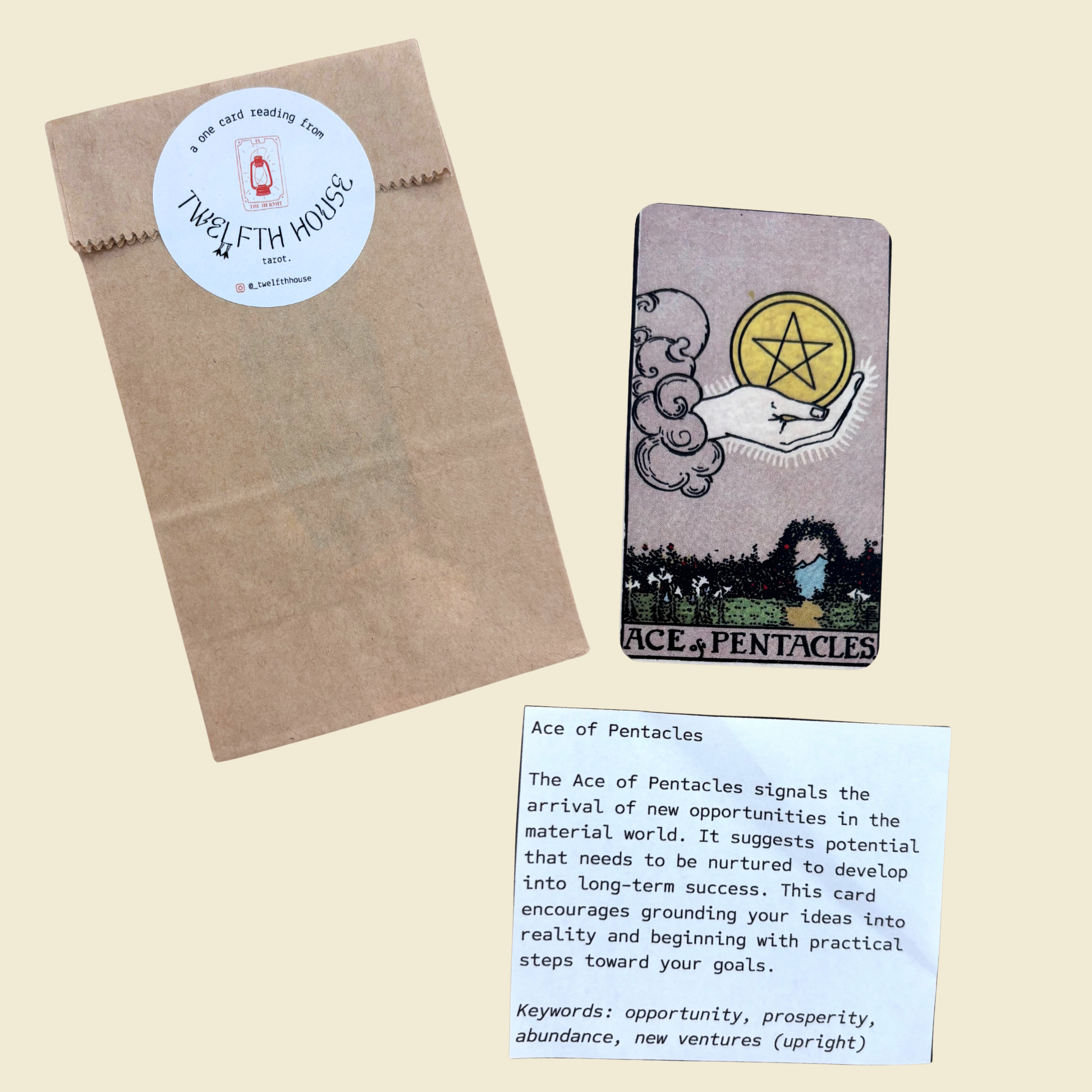 Each One Card Tarot Pull includes a single card and a mini reading pulled from the pages of the library at Twelfth House. Each little package was made with love and chosen with care and magic. The intention is for the recipient to keep a little of that magic with them wherever they go - the Twelfth House is a place they can return for sanctuary and home whenever they need it.