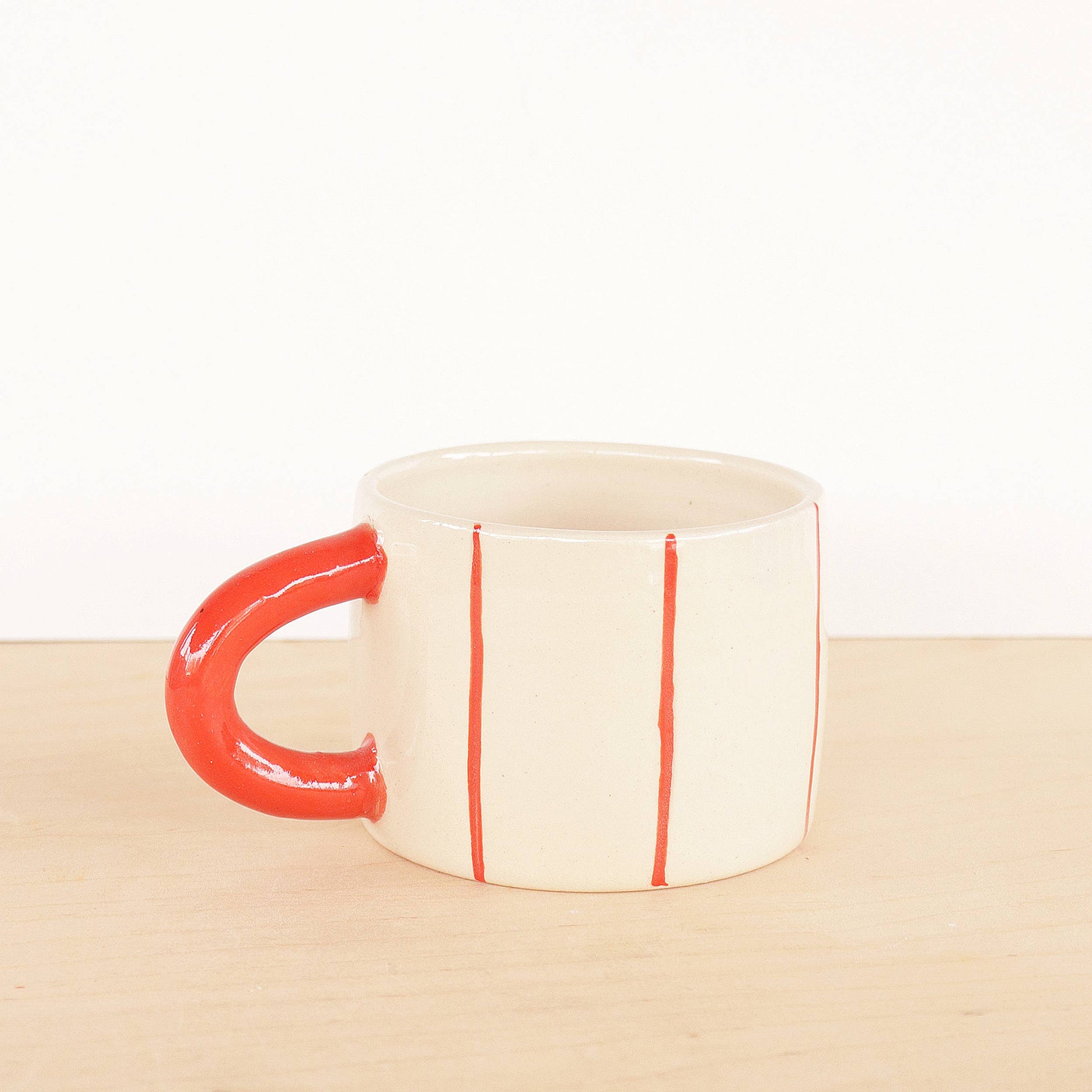 Handmade ceramic mug with vibrant, colourful stripes. Easy to hold handle makes this mug one you will reach for again and again! Dishwasher safe. Approx 3” height Holds approx 12 oz.