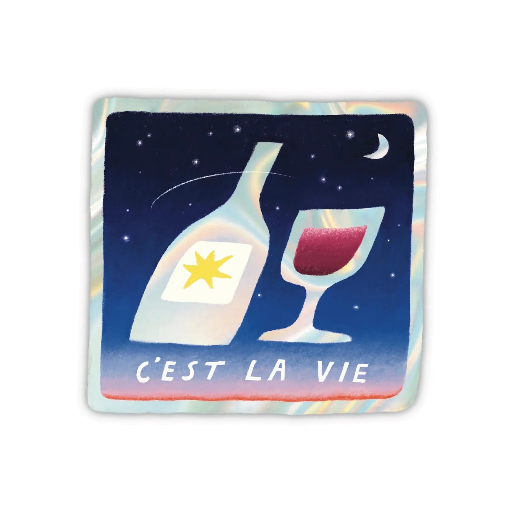 This sticker is for everyone who loves to contemplate life under the starry sky, accompanied by a fine glass of wine. By Canadian artist, Foonie.